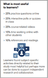 The 2020 JISC Digital Insights Survey of FE Learners (completed by 19,137 FE students), reported the following responses to the question, “What is most useful to learners?” when considering online learning experiences. Participating students reported these as being the most valuable.